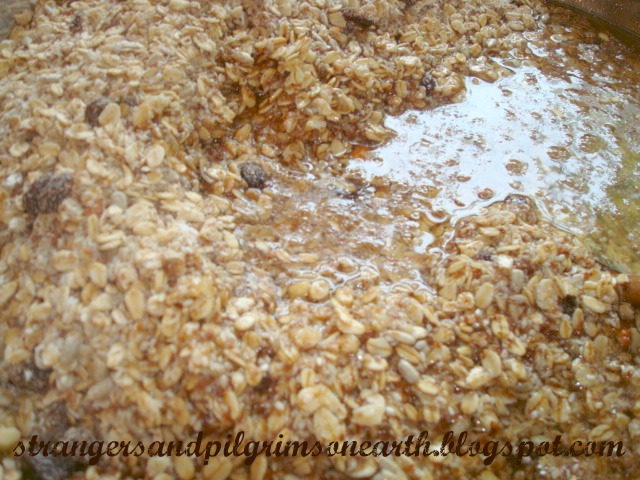 Pour sauce into the dry ingredients. Mix all the goodness together until everything is evenly coated. Place on cookie sheets (single layer) and bake in batches (275 degrees) according to how much you want to have on hand. It usually takes about thirty minutes and needs to be stirred twice (about 10 and 20 minutes into your baking).