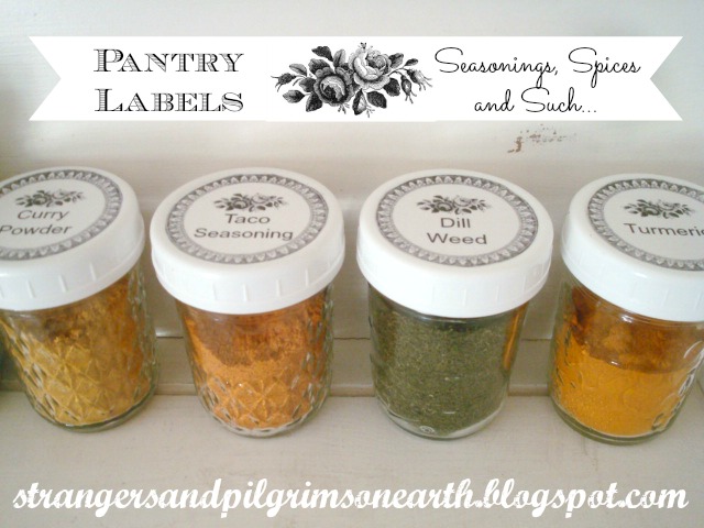 For a set of our pantry labels featuring "Seasonings, Spices and Such", simply download and/or print from this link HERE. You can either print them out on plain paper, cut to size and affix to your containers with glue (or decoupage) or print them out on sticker paper and cut to size. If you choose the first route, you may want to place a piece of packing tape or clear contact paper over each label to protect them. You may also be interested in our "Basic Pantry Labels" and our set for "Nuts and Seeds".