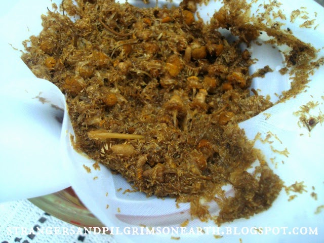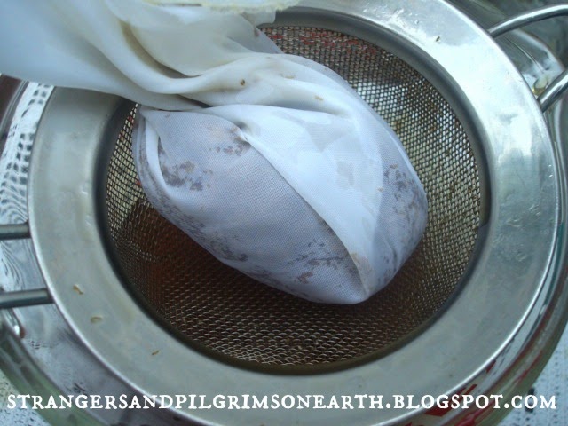 Once contents are emptied into the strainer, gather your fabric into a small satchel and squeeze the leftover herbs to extract the last of the golden medicinal liquid.