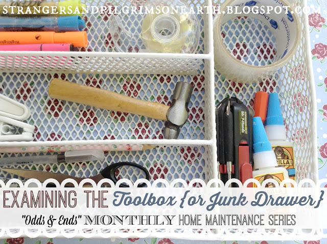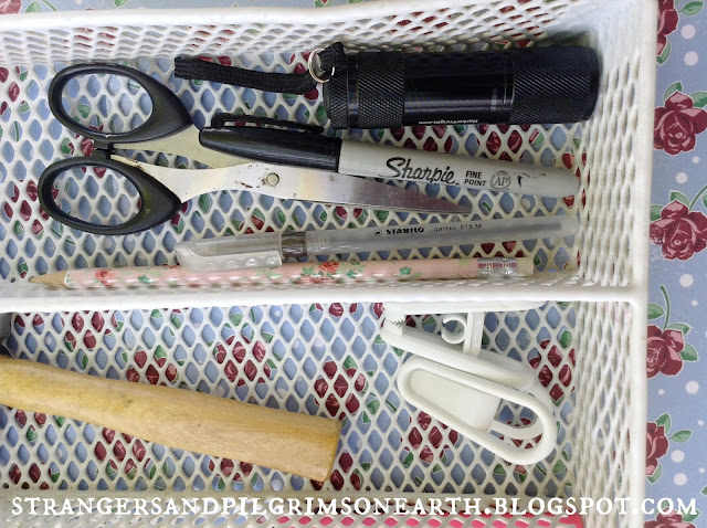 Since drawer space is minimal in our home, we keep a small utensil caddy on a shelf which acts as both mini tool box and "junk drawer". This stores our handy homemaking basics such as a hobby hammer, 7-head screwdriver tool (which I love!), glue to fix minor household items, measuring tape, packing tape, regular tape, pens, markers, highlighters, tape measure, small flashlight and a few other odds and ends. These items keep our home running smoothly for the most part. Repairs which require "more involved" tools are done by my dear husband.